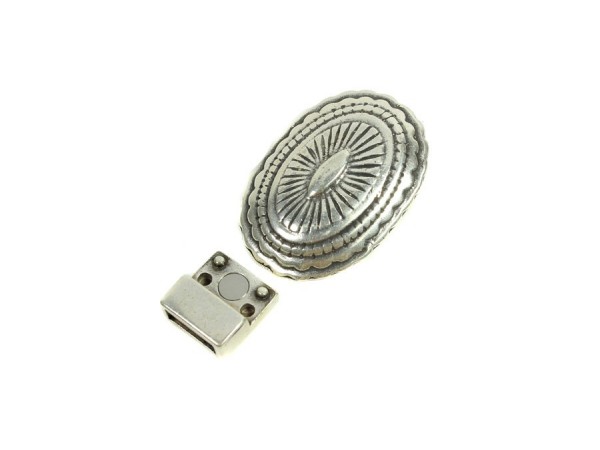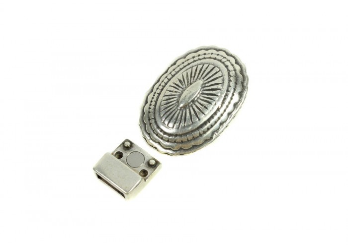 Cierre imán 4 puntos zamak baño plata oval labrado 37 x 26 mm pase 10 x 2.5 mm