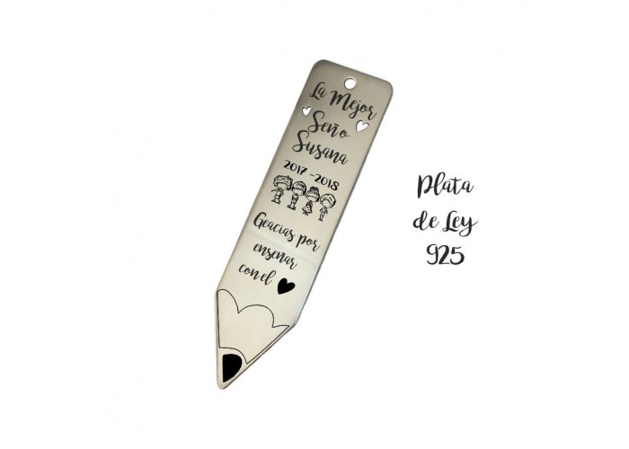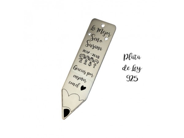 Marcapáginas Lápiz fabricado en Plata de Ley con los nombre de la Seño y los Alumnos